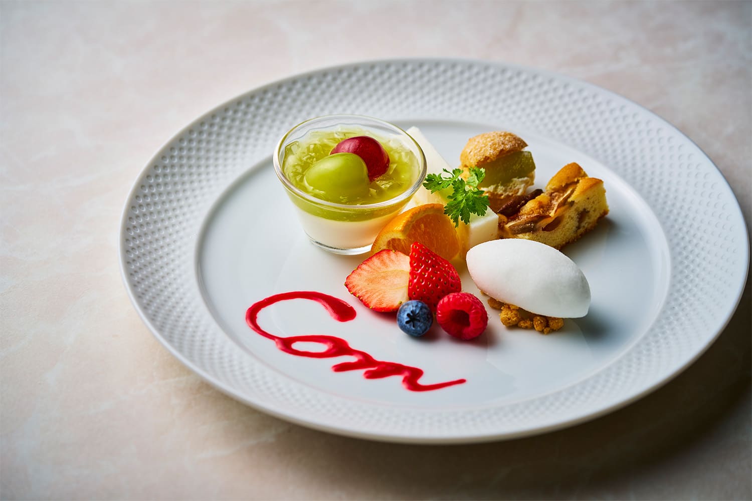 食事の始まりを彩る前菜から、石窯で丁寧に焼き上げられる「チキンの塩麴マリネと神戸ポークのロースト」まで、シェフこだわりの本格的な味わいをご堪能いただけます。